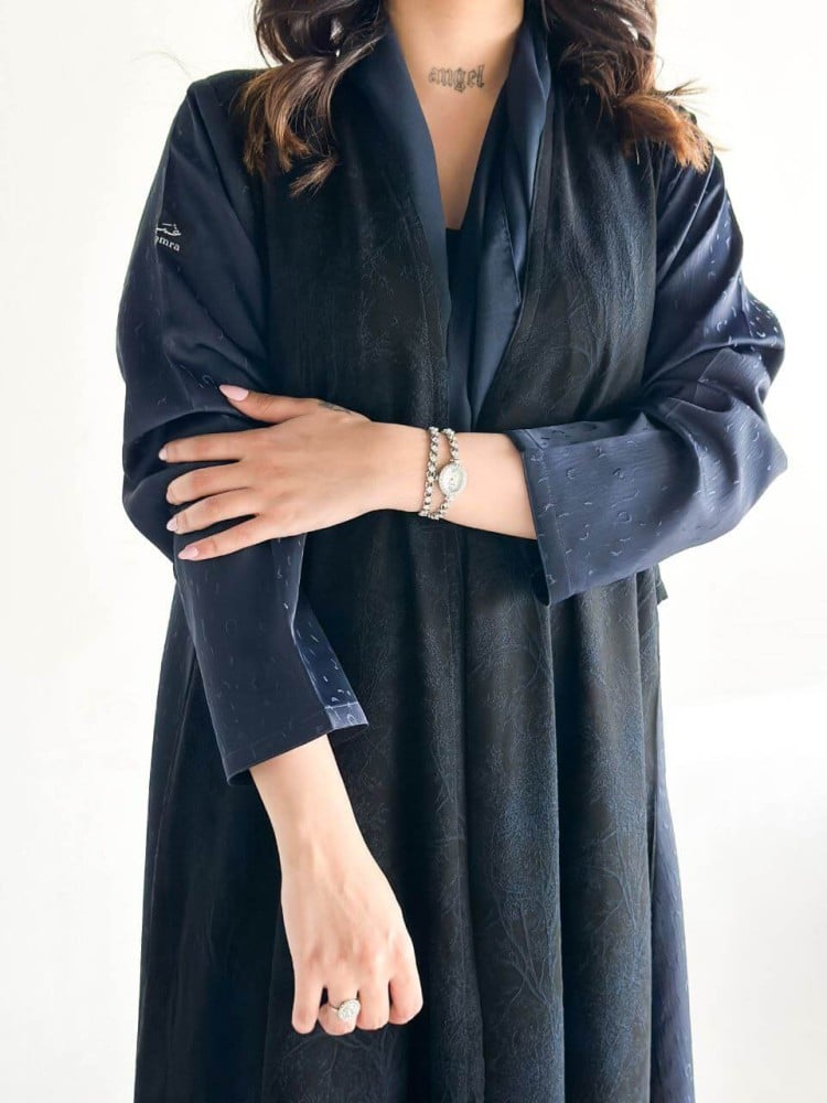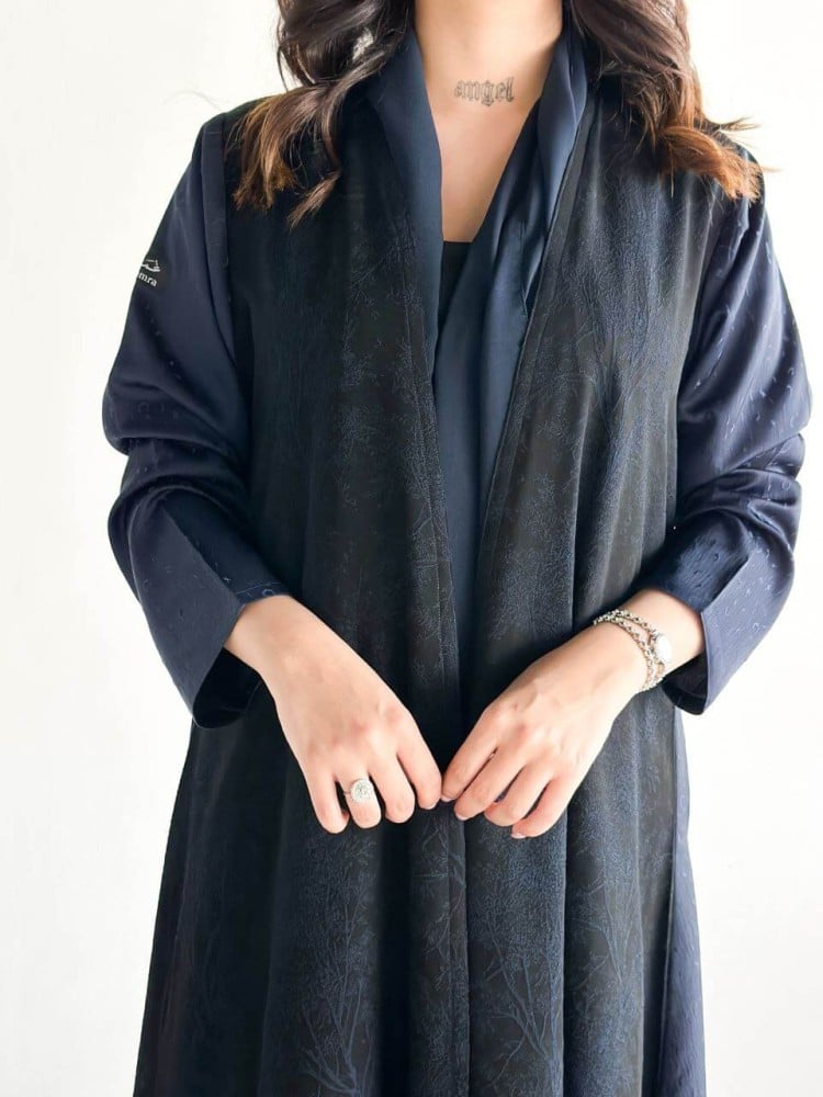 • تتميز العباية بخامة الجاكار الفاخرة مع التفتا الأمريكي، وهذا يمنحها ملمساً ناعماً وفخماً بالإضافة إلى مقاومة عالية للتجاعيد، لذا يجعلها خياراً مثالياً للمناسبات الخاصة.