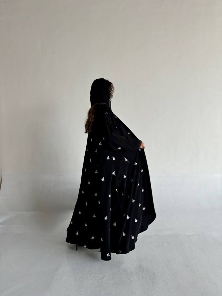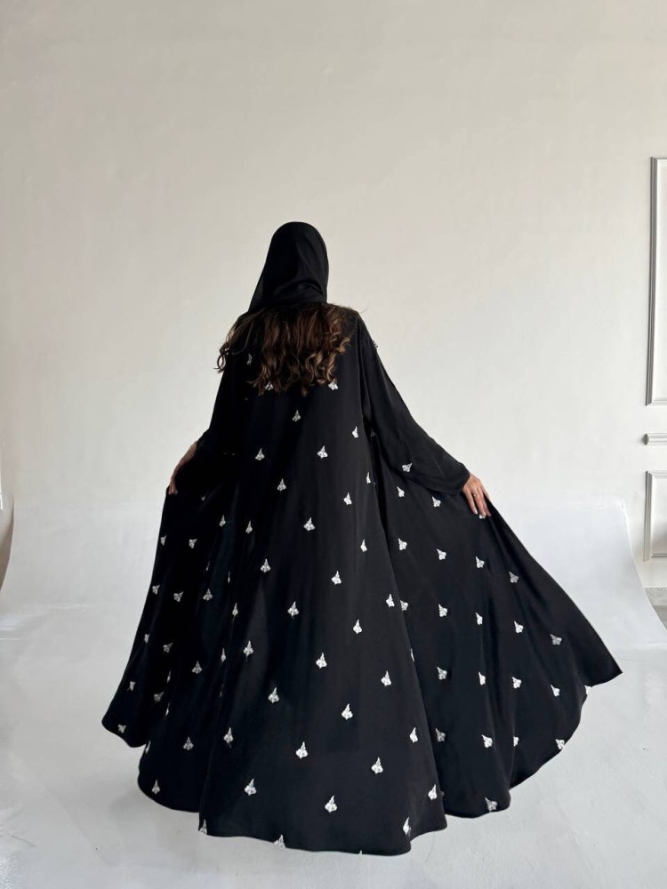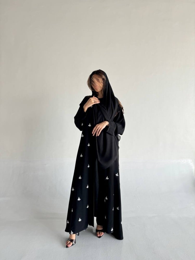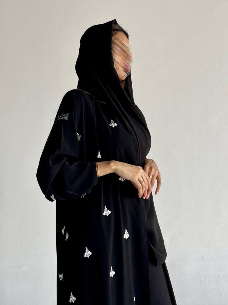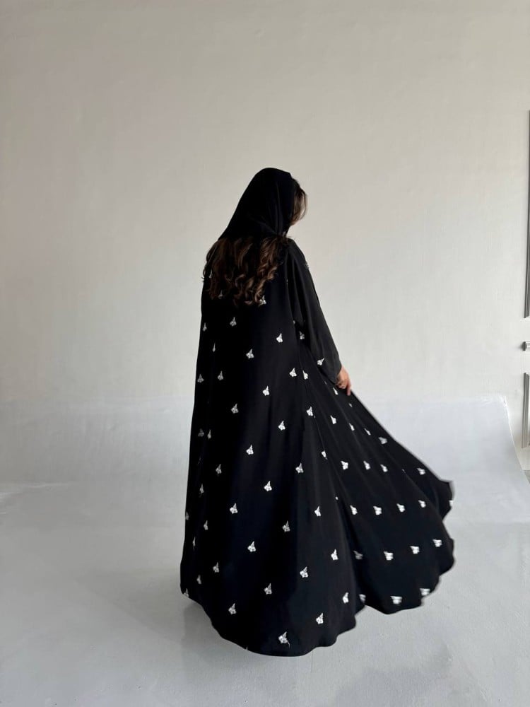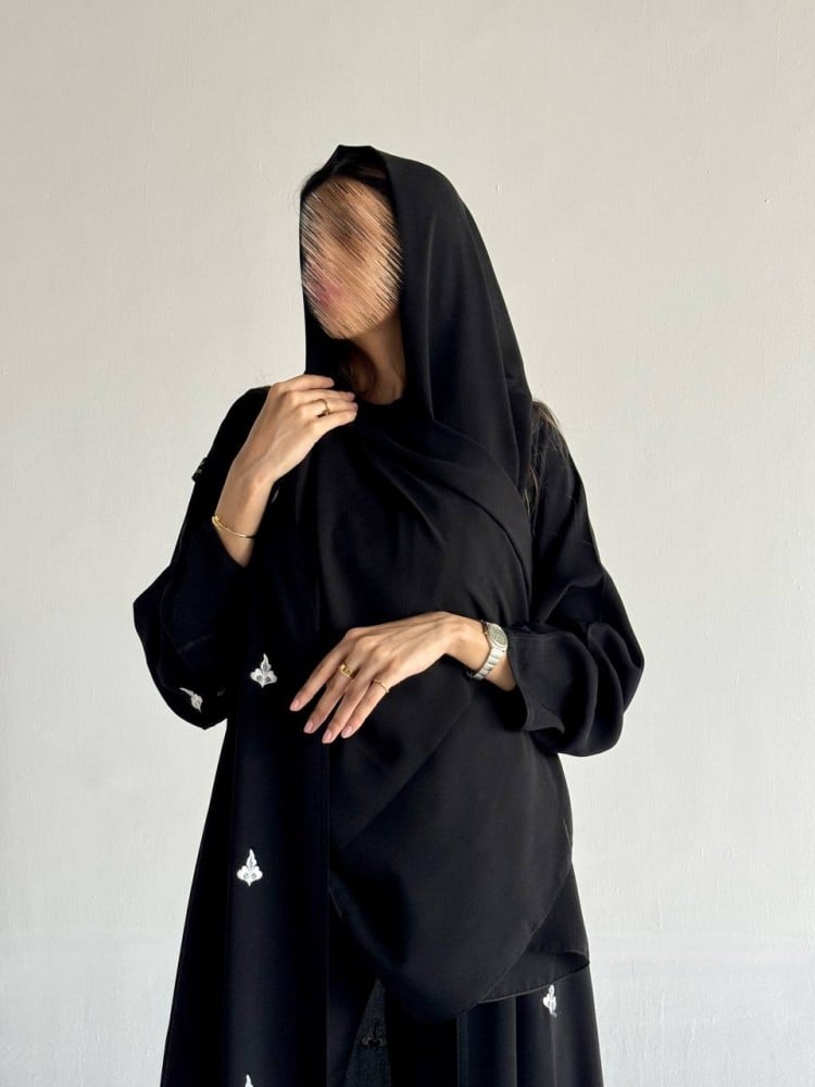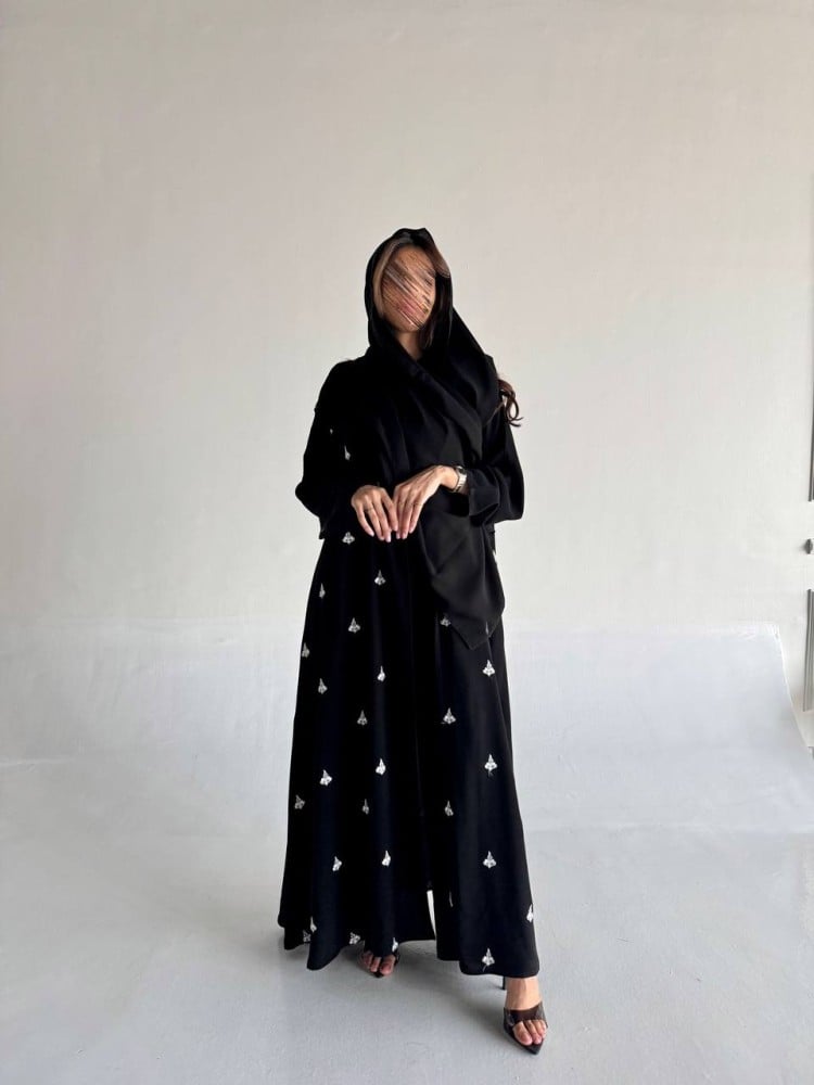 • تمتاز العباية بتطريز سكري يبرز على خلفية القماش الأسود ليضفي لمسة من الرقي والفخامة، وهذا يجعلها خيارًا مثاليًا للمرأة التي تبحث عن الأناقة في تفاصيل إطلالتها.