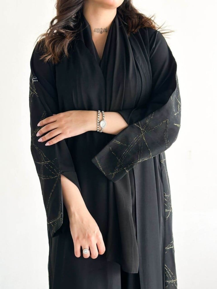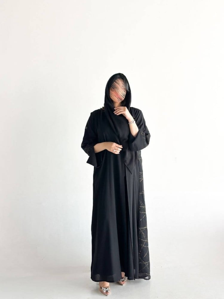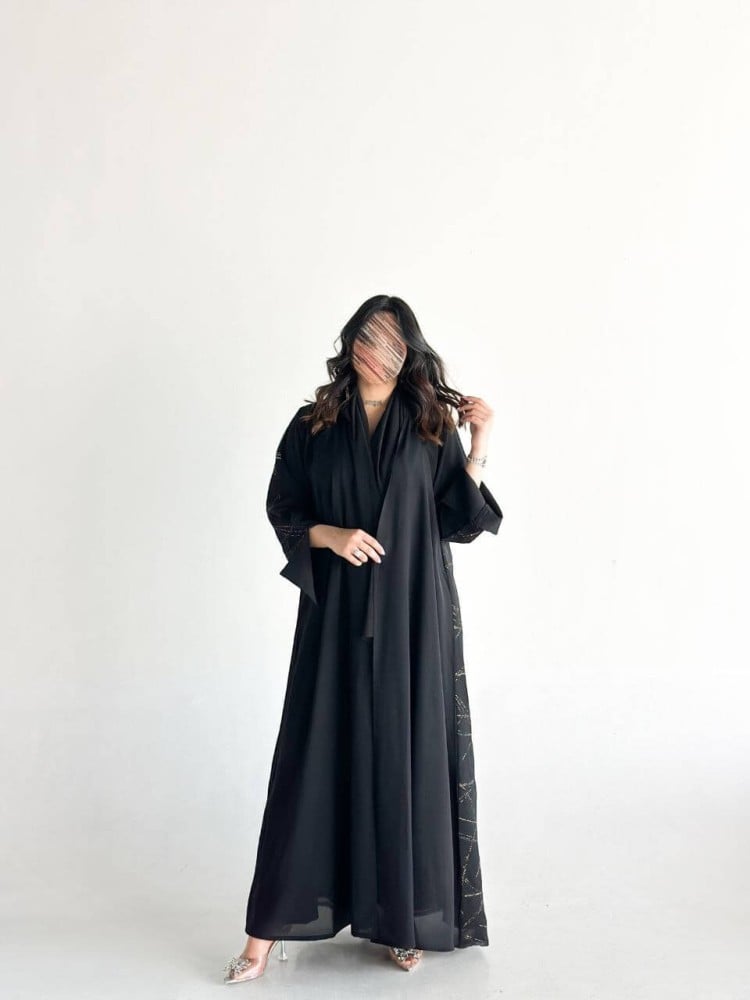 • تضم العباية تفاصيل مميزة على الظهر، بالإضافة إلى فتحة الأكمام، مما يضيف لمسة جمالية فريدة. هذه التفاصيل تعكس الذوق الرفيع وتمنح العباية لمسة من الأناقة والتميز.